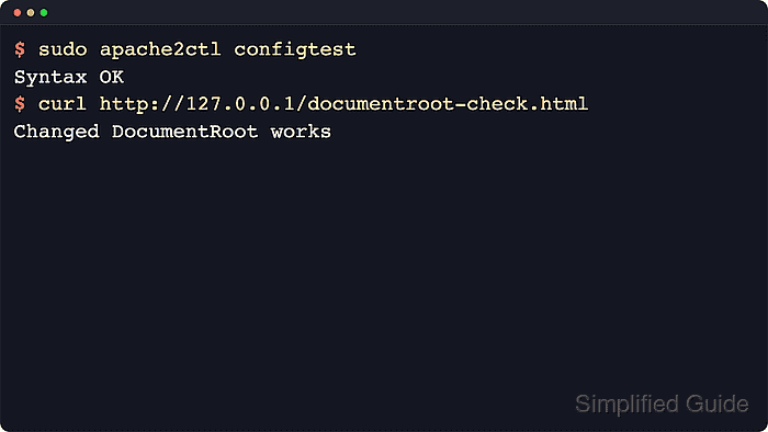 - Request the marker file through the target virtual host to confirm Apache now serves content from the new directory.