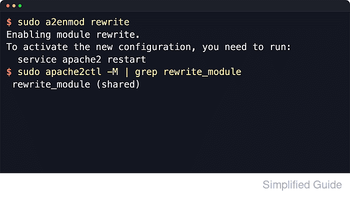 $ sudo apache2ctl -M | grep rewrite_module rewrite_module (shared)