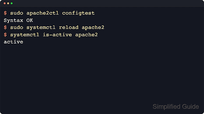 A syntax test should happen before every reload or restart because a service command still depends on Apache accepting the loaded configuration. The steps below use the current Debian and Ubuntu apache2 defaults confirmed against a current package environment, and the notes call out the common httpd substitution for RHEL-style systems.