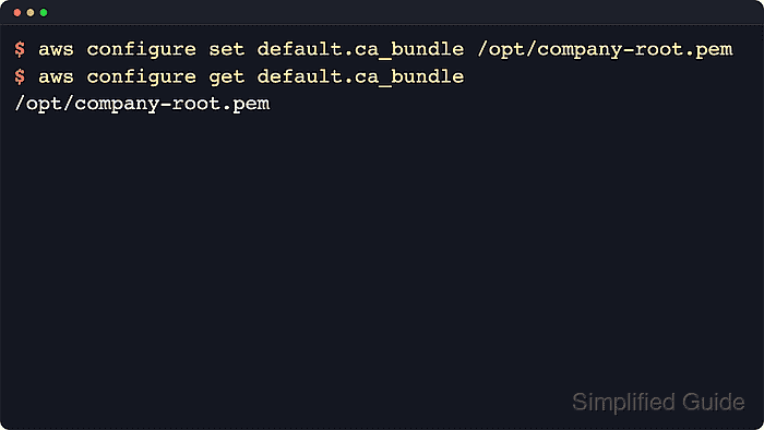 $ aws configure set ca_bundle /etc/pki/anchors/company-root-ca.pem