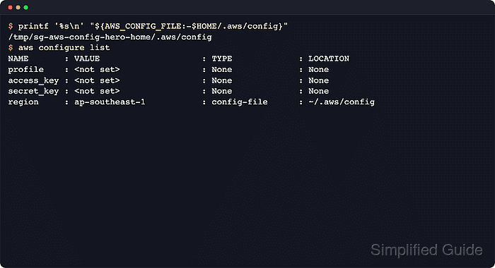 $ aws configure list NAME : VALUE : TYPE : LOCATION profile : <not set> : None : None access_key : <not set> : None : None secret_key : <not set> : None : None region : ap-southeast-1 : config-file : ~/.aws/config
