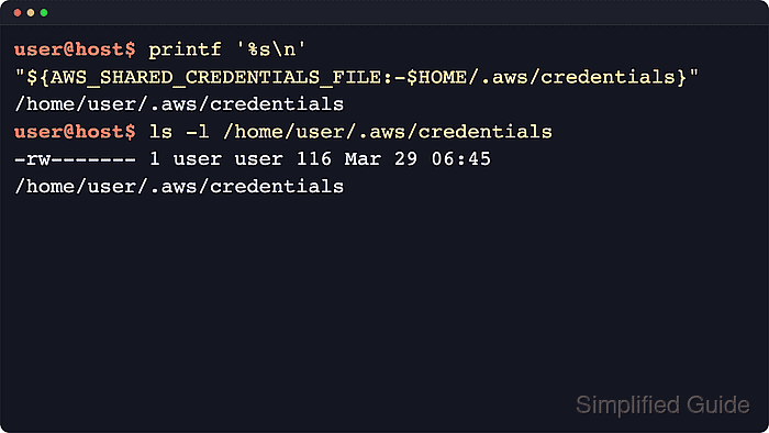 $ printf '%s\n' "${AWS_SHARED_CREDENTIALS_FILE:-$HOME/.aws/credentials}" /home/user/.aws/credentialsOn Windows, the default shared credentials path is %USERPROFILE%\.aws\credentials when AWS_SHARED_CREDENTIALS_FILE is not set.
