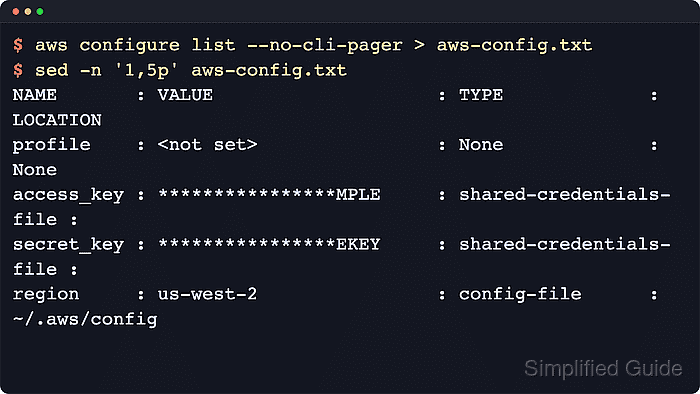 $ aws configure list --no-cli-pager > ~/aws-output/aws-config.txt $ sed -n '1,5p' ~/aws-output/aws-config.txt NAME : VALUE : TYPE : LOCATION profile : <not set> : None : None access_key : ****************MPLE : shared-credentials-file : secret_key : ****************EKEY : shared-credentials-file : region : us-west-2 : config-file : ~/.aws/config
