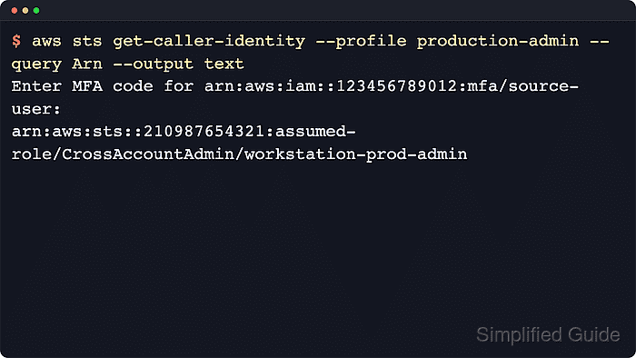 $ aws sts get-caller-identity --profile operations-admin --query Arn --output text Enter MFA code for arn:aws:iam::123456789012:mfa/source-user: arn:aws:sts::210987654321:assumed-role/CrossAccountAdmin/workstation-ops-admin