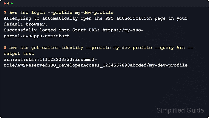 $ aws sts get-caller-identity --profile my-dev-profile { "UserId": "AROAEXAMPLEID:my-dev-profile", "Account": "111122223333", "Arn": "arn:aws:sts::111122223333:assumed-role/AWSReservedSSO_DeveloperAccess_1234567890abcdef/my-dev-profile" }The Account and Arn fields confirm which AWS account and IAM Identity Center permission set the CLI actually resolved from the cached session.