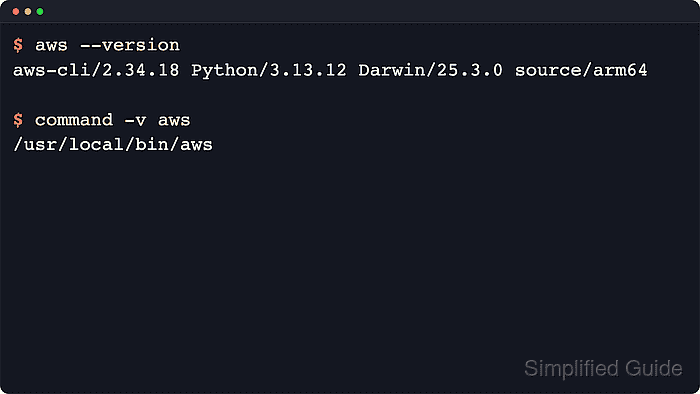 $ aws --version aws-cli/2.34.18 Python/3.13.12 Darwin/25.3.0 source/arm64