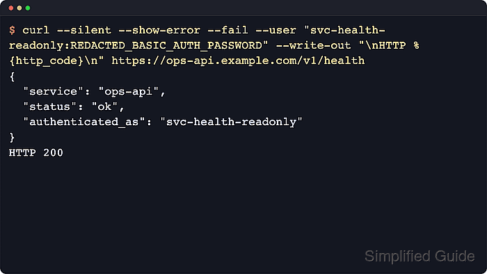 $ curl --silent --show-error --fail --user "svc-health-readonly:REDACTED_BASIC_AUTH_PASSWORD" --write-out "\nHTTP %{http_code}\n" https://ops-api.example.com/v1/health { "service": "ops-api", "status": "ok", "authenticated_as": "svc-health-readonly" } HTTP 200Combining the response body with an HTTP 200 trailer makes it easier to distinguish an auth success from a network or application failure in automation.