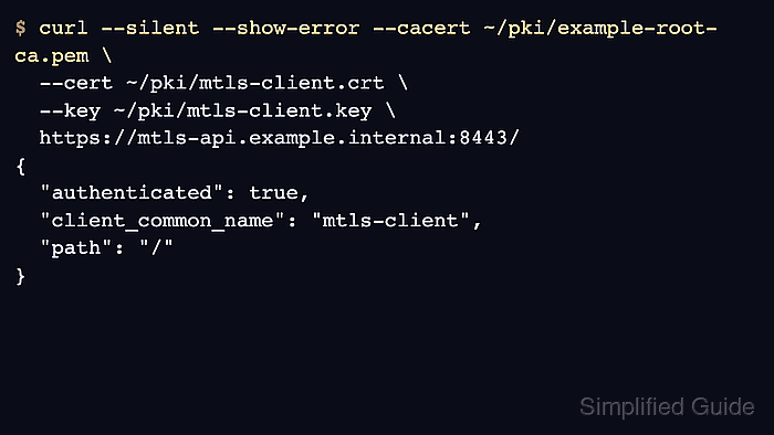 $ cat ~/pki/payments-api-client.crt ~/pki/payments-api-client.key > ~/pki/payments-api-client.pem $ chmod 600 ~/pki/payments-api-client.pem $ curl --silent --show-error --cacert ~/pki/corp-root-ca.pem \ --cert ~/pki/payments-api-client.pem \ --resolve payments-api.int.example.com:8443:192.0.2.24 \ https://payments-api.int.example.com:8443/ --output /dev/null \ --write-out 'response=%{response_code}\n' response=200PKCS#12 archives such as client.p12 or client.pfx use a different cURL flow and should not be treated as PEM files.
