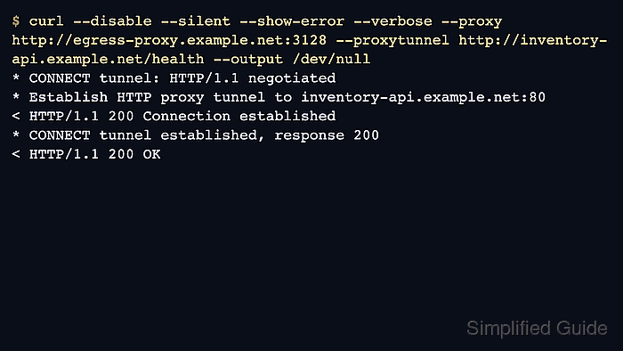 $ curl -q -v --proxy http://egress-proxy.ops.example.test:8080 --proxytunnel http://inventory-api.example.test/v1/health -o /dev/null * Trying 198.51.100.18:8080... * Connected to egress-proxy.ops.example.test (198.51.100.18) port 8080 * CONNECT tunnel: HTTP/1.1 negotiated * Establish HTTP proxy tunnel to inventory-api.example.test:80 > CONNECT inventory-api.example.test:80 HTTP/1.1 > Host: inventory-api.example.test:80 > User-Agent: curl/8.7.1 > Proxy-Connection: Keep-Alive < HTTP/1.1 200 Connection established * CONNECT phase completed * CONNECT tunnel established, response 200 > GET /v1/health HTTP/1.1 > Host: inventory-api.example.test < HTTP/1.1 200 OK < X-Request-Id: req_01HV7KQW4X8PD9M2E3C6F1G5JN