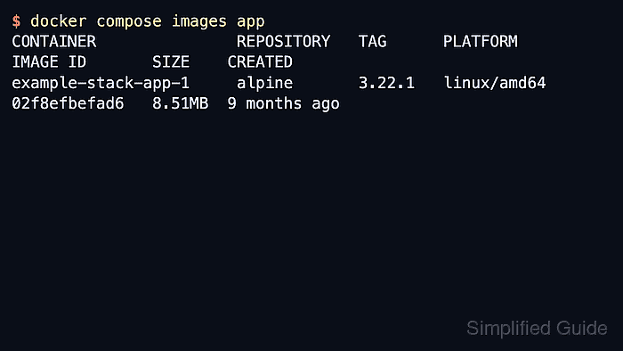 $ docker compose images app CONTAINER REPOSITORY TAG PLATFORM IMAGE ID SIZE CREATED example-stack-app-1 alpine 3.22.1 linux/amd64 02f8efbefad6 8.51MB 9 months ago