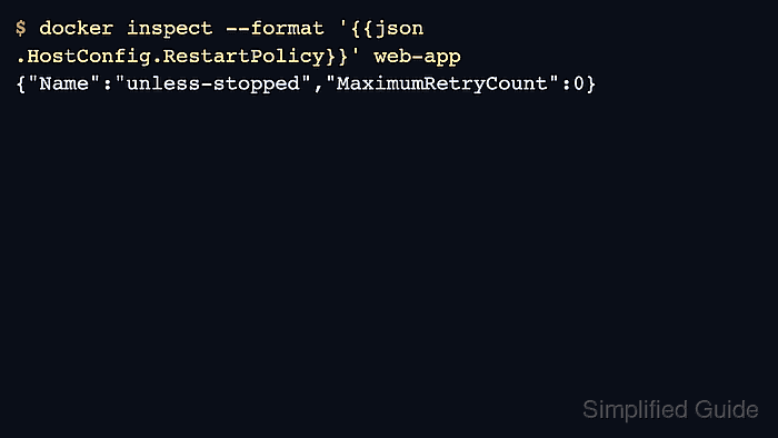 $ docker inspect --format '{{json .HostConfig.RestartPolicy}}' web-app {"Name":"unless-stopped","MaximumRetryCount":0}