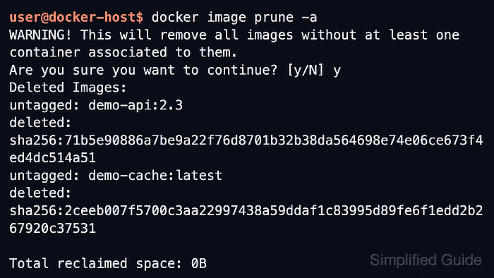 $ docker image prune -a WARNING! This will remove all images without at least one container associated to them. Are you sure you want to continue? [y/N] y Deleted Images: untagged: demo-api:2.3 deleted: sha256:71b5e90886a7be9a22f76d8701b32b38da564698e74e06ce673f4ed4dc514a51 untagged: demo-cache:latest deleted: sha256:2ceeb007f5700c3aa22997438a59ddaf1c83995d89fe6f1edd2b267920c37531 Total reclaimed space: 0B