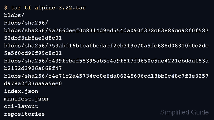 When manifest.json, repositories, and the layer blobs are present, the archive is ready for transfer or a later docker image load --input alpine-3.22.tar workflow. Related: How to load a Docker image from a tarball