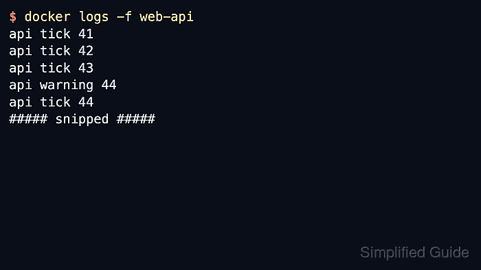 $ docker logs -f web-api api tick 41 api tick 42 api tick 43 api warning 44 api tick 44