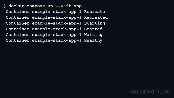 $ docker compose up --wait app Container example-stack-app-1 Recreate Container example-stack-app-1 Recreated Container example-stack-app-1 Starting Container example-stack-app-1 Started Container example-stack-app-1 Waiting Container example-stack-app-1 Healthy