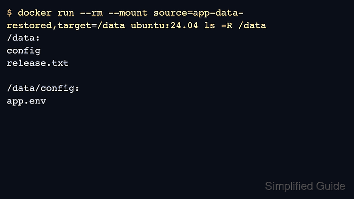 $ docker run --rm --mount source=app-data-restored,target=/data ubuntu:24.04 ls -R /data /data: config release.txt /data/config: app.env