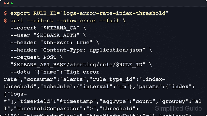 $ export RULE_ID="logs-error-rate-index-threshold" $ curl --silent --show-error --fail \ --cacert "$KIBANA_CA" \ --user "$KIBANA_AUTH" \ --header "kbn-xsrf: true" \ --header "Content-Type: application/json" \ --request POST \ "$KIBANA_API_BASE/alerting/rule/$RULE_ID" \ --data '{ "name": "High error rate", "consumer": "alerts", "rule_type_id": ".index-threshold", "schedule": { "interval": "1m" }, "params": { "index": [ "logs-*" ], "timeField": "@timestamp", "aggType": "count", "groupBy": "all", "thresholdComparator": ">", "threshold": [ 100 ], "timeWindowSize": 5, "timeWindowUnit": "m" }, "actions": [], "tags": [ "logs", "ops" ] }' | jq '{id: .id, name: .name, enabled: .enabled, consumer: .consumer, rule_type_id: .rule_type_id}' { "id": "logs-error-rate-index-threshold", "name": "High error rate", "enabled": true, "consumer": "alerts", "rule_type_id": ".index-threshold" }Post to $KIBANA_API_BASE/alerting/rule instead when Kibana should generate the rule ID automatically.