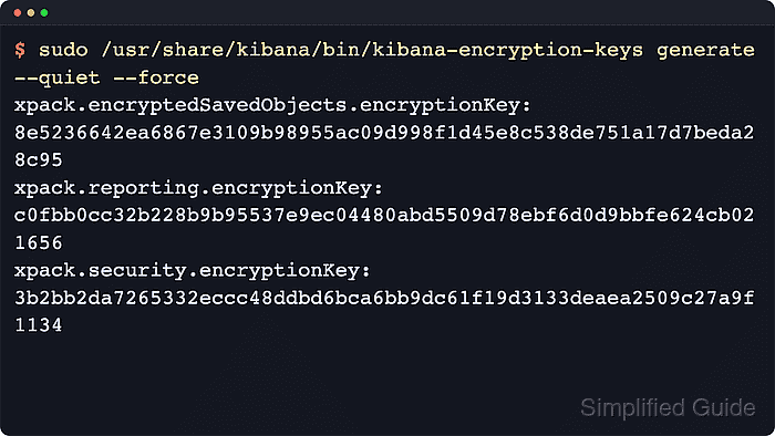 $ sudo /usr/share/kibana/bin/kibana-encryption-keys generate --quiet --force xpack.encryptedSavedObjects.encryptionKey: 8e5236642ea6867e3109b98955ac09d998f1d45e8c538de751a17d7beda28c95 xpack.reporting.encryptionKey: c0fbb0cc32b228b9b95537e9ec04480abd5509d78ebf6d0d9bbfe624cb021656 xpack.security.encryptionKey: 3b2bb2da7265332eccc48ddbd6bca6bb9dc61f19d3133deaea2509c27a9f1134