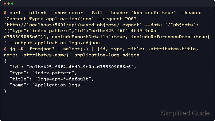 $ curl --silent --show-error --fail \ --header 'kbn-xsrf: true' \ --header 'Content-Type: application/json' \ --request POST 'http://localhost:5601/api/saved_objects/_export' \ --data '{ "objects": [ { "type": "index-pattern", "id": "ce1bc425-f6f4-4bd9-9e0a-d755609086c6" } ], "excludeExportDetails": true, "includeReferencesDeep": true }' \ --output application-logs.ndjsonUse includeReferencesDeep when the selected object depends on other saved objects. Exported dashboards, for example, can pull in their associated data views and other referenced objects.