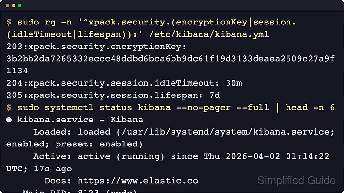 $ sudo systemctl status kibana --no-pager --full | head -n 12 ● kibana.service - Kibana Loaded: loaded (/usr/lib/systemd/system/kibana.service; enabled; preset: enabled) Active: active (running) since Thu 2026-04-02 01:14:22 UTC; 17s ago Docs: https://www.elastic.co Main PID: 8123 (node) Tasks: 11 (limit: 28486) Memory: 1008.3M (peak: 1.4G) CPU: 31.558s ##### snipped #####Use journalctl –unit=kibana –no-pager -n 50 if the unit never reaches active (running) or loops during startup.