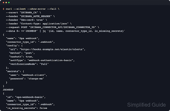 $ curl --silent --show-error --fail \ --cacert "$KIBANA_CA" \ --header "$KIBANA_AUTH_HEADER" \ --header "kbn-xsrf: true" \ --header "Content-Type: application/json" \ --request POST "$KIBANA_CONNECTOR_API/$KIBANA_CONNECTOR_ID" \ --data @- <<'EOF' | jq '{id, name, connector_type_id, is_missing_secrets}' { "name": "Ops webhook", "connector_type_id": ".webhook", "config": { "url": "https://hooks.example.net/elastic/alerts", "method": "post", "hasAuth": true, "authType": "webhook-authentication-basic", "verificationMode": "full" }, "secrets": { "user": "webhook-client", "password": "change-me" } } EOF { "id": "ops-webhook-basic", "name": "Ops webhook", "connector_type_id": ".webhook", "is_missing_secrets": false }Current Kibana API docs use a caller-supplied connector id in the request path, so the create call goes to /api/actions/connector/<id> rather than the older no-id create path. The kbn-xsrf header is required for this non-GET Kibana API request.