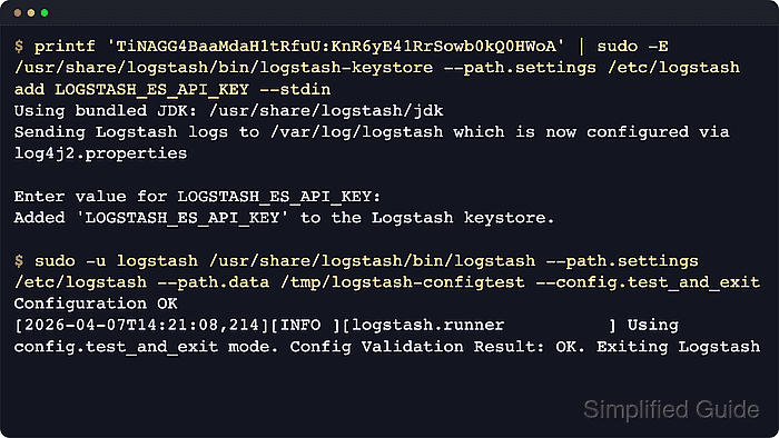 $ sudo -u logstash /usr/share/logstash/bin/logstash --path.settings /etc/logstash --path.data /tmp/logstash-configtest --config.test_and_exit Using bundled JDK: /usr/share/logstash/jdk Sending Logstash logs to /var/log/logstash which is now configured via log4j2.properties Configuration OK [2026-04-07T14:21:08,214][INFO ][logstash.runner ] Using config.test_and_exit mode. Config Validation Result: OK. Exiting Logstash