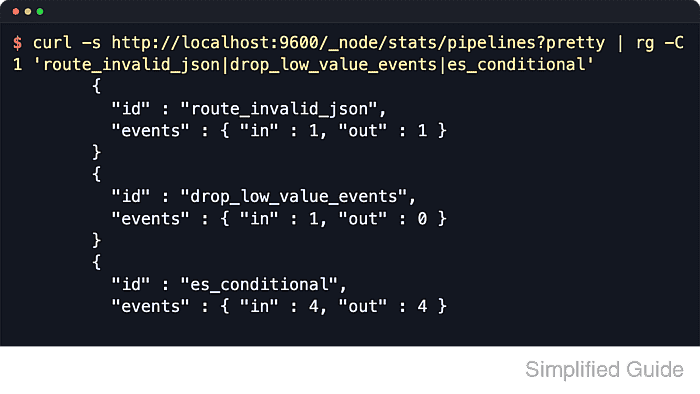 $ curl --silent --show-error http://localhost:9600/_node/stats/pipelines?pretty=true { "pipelines" : { "main" : { "plugins" : { "filters" : [ { "id" : "route_invalid_json", "events" : { "in" : 1, "out" : 1 } }, { "id" : "route_missing_level", "events" : { "in" : 1, "out" : 1 } }, { "id" : "route_production_error", "events" : { "in" : 1, "out" : 1 } }, { "id" : "route_default", "events" : { "in" : 1, "out" : 1 } }, { "id" : "drop_low_value_events", "events" : { "in" : 1, "out" : 0 } } ], "outputs" : [ { "id" : "es_conditional", "events" : { "in" : 4, "out" : 4 } } ] } } } }If localhost:9600 does not respond, query the API on the first free port in the 9600-9700 range or check the service journal for the bound port.