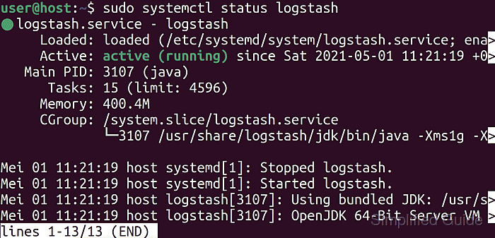 $ sudo systemctl status logstash --no-pager ● logstash.service - logstash Loaded: loaded (/usr/lib/systemd/system/logstash.service; enabled; preset: enabled) Active: active (running) since Wed 2026-01-07 04:23:00 UTC; 24min ago ##### snipped #####