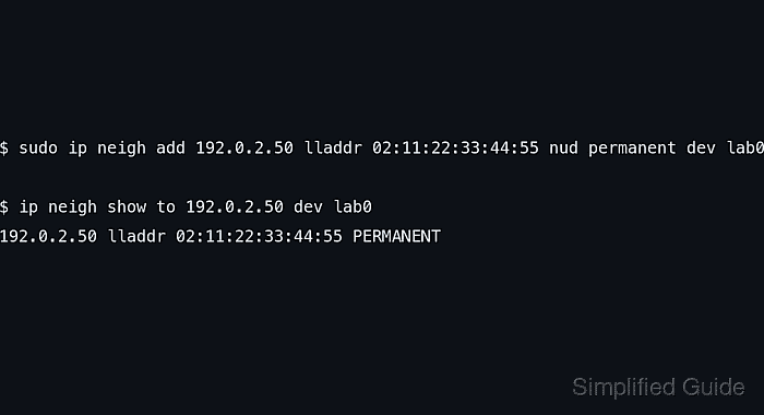 Adding a static neighbor entry with ip neigh add is useful when a host must always send traffic for one peer to a known MAC address. This is common for tightly controlled lab networks, bootstrap scenarios, or troubleshooting cases where dynamic neighbor discovery is suspected to be wrong.