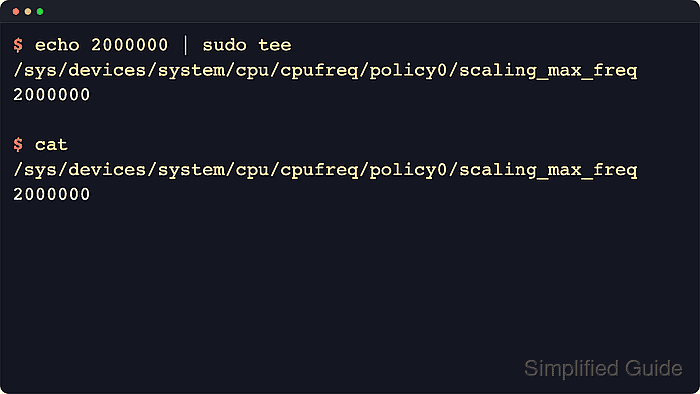 $ echo 2000000 | sudo tee /sys/devices/system/cpu/cpufreq/policy0/scaling_max_freq 2000000