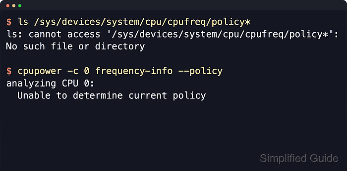 The commands below were verified against current cpupower behavior on Ubuntu 24.04 and CentOS 10 ARM64 guests under Parallels. Both guests exposed the cpupower command but not a live cpufreq driver, so Unable to determine current policy, Not Available, and no or unknown cpufreq driver are the decisive results in that environment. On physical hosts or supported virtual machines that export CPUFreq policy data, the same commands show the active ceiling directly.