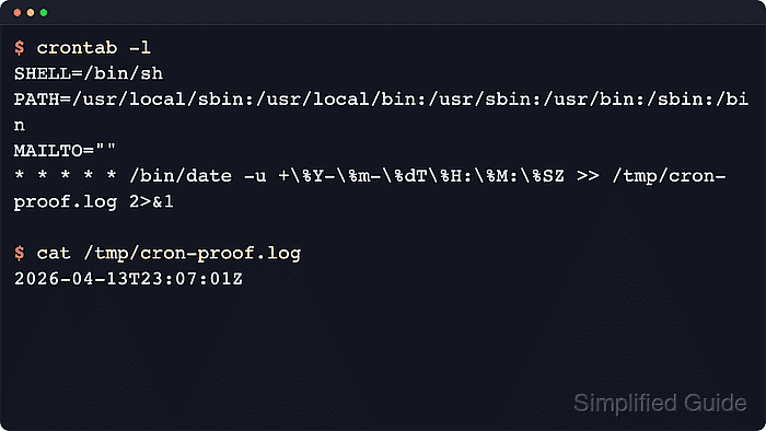 $ cat /tmp/cron-proof.log 2026-04-14T11:30:01Z
