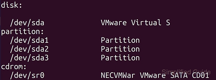 Replace /dev/sda with the disk from the earlier inventory, such as /dev/sdb, /dev/vda, or /dev/nvme0n1. The partition paths from this output are the ones you pass to tools such as mount, fsck, or blkid.