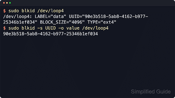 $ sudo blkid -s UUID -o value /dev/loop4 90e3b518-5ab8-4162-b977-25346b1ef034