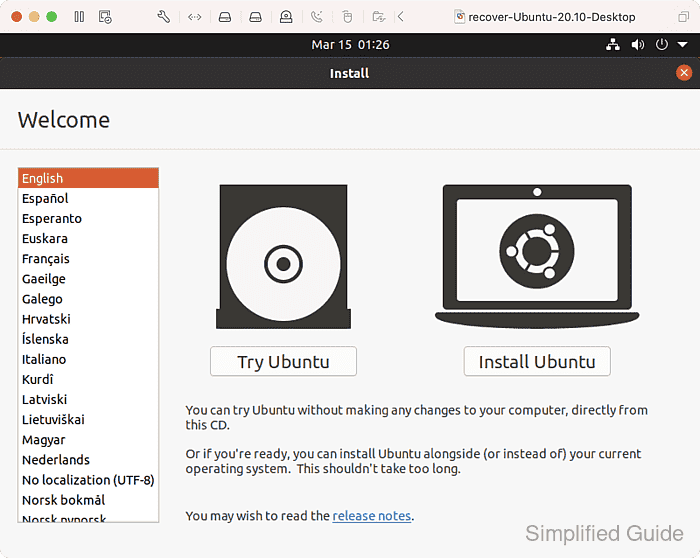 For Ubuntu live media, choose Try Ubuntu instead of starting the installer so the internal disks stay offline while you recover data.