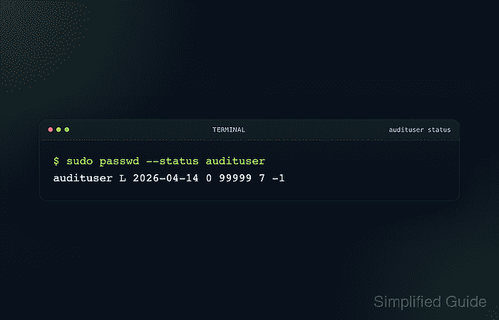 $ sudo passwd --status audituser audituser L 2026-04-14 0 99999 7 -1