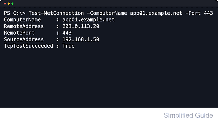 PS C:\> Test-NetConnection -ComputerName app01.example.net -Port 443 ComputerName : app01.example.net RemoteAddress : 203.0.113.20 RemotePort : 443 InterfaceAlias : Ethernet SourceAddress : 192.168.1.50 TcpTestSucceeded : True