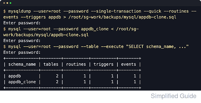 $ mysqldump --user=root --password --single-transaction --quick --routines --events --triggers appdb > /root/sg-work/backups/mysql/appdb-clone.sql Enter password: