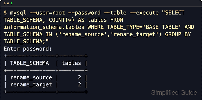 $ mysql --user=root --password --execute " SELECT s.schema_name, (SELECT COUNT(*) FROM information_schema.tables t WHERE t.table_schema=s.schema_name AND t.table_type='BASE TABLE') AS tables, (SELECT COUNT(*) FROM information_schema.tables v WHERE v.table_schema=s.schema_name AND v.table_type='VIEW') AS views, (SELECT COUNT(*) FROM information_schema.routines r WHERE r.routine_schema=s.schema_name) AS routines, (SELECT COUNT(*) FROM information_schema.triggers tr WHERE tr.trigger_schema=s.schema_name) AS triggers, (SELECT COUNT(*) FROM information_schema.events e WHERE e.event_schema=s.schema_name) AS events FROM ( SELECT 'rename_source' AS schema_name UNION ALL SELECT 'rename_target' AS schema_name ) s; " Enter password: +---------------+--------+-------+----------+----------+--------+ | schema_name | tables | views | routines | triggers | events | +---------------+--------+-------+----------+----------+--------+ | rename_source | 2 | 1 | 1 | 1 | 1 | | rename_target | 2 | 1 | 1 | 1 | 1 | +---------------+--------+-------+----------+----------+--------+