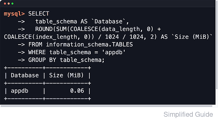 mysql> SELECT -> table_schema AS `Database`, -> ROUND(SUM(COALESCE(data_length, 0) + COALESCE(index_length, 0)) / 1024 / 1024, 2) AS `Size (MiB)` -> FROM information_schema.TABLES -> WHERE table_schema = 'appdb' -> GROUP BY table_schema; +----------+------------+ | Database | Size (MiB) | +----------+------------+ | appdb | 0.06 | +----------+------------+Replace appdb with the schema name returned by SHOW DATABASES.