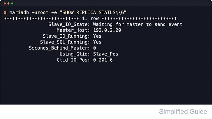 $ mariadb -u root -p -e "SHOW REPLICA STATUS\G" *************************** 1. ROW *************************** Slave_IO_State: Waiting FOR master TO send event Master_Host: 192.0.2.20 Slave_IO_Running: Yes Slave_SQL_Running: Yes Seconds_Behind_Master: 0 Using_Gtid: Slave_Pos Gtid_IO_Pos: 0-201-6 ##### snipped #####
