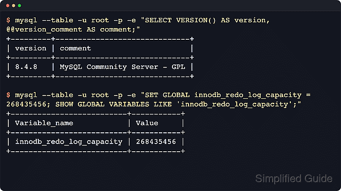 $ mysql --table -u root -p -e "SET GLOBAL innodb_redo_log_capacity = 268435456; SHOW GLOBAL VARIABLES LIKE 'innodb_redo_log_capacity';" +--------------------------+-----------+ | Variable_name | Value | +--------------------------+-----------+ | innodb_redo_log_capacity | 268435456 | +--------------------------+-----------+