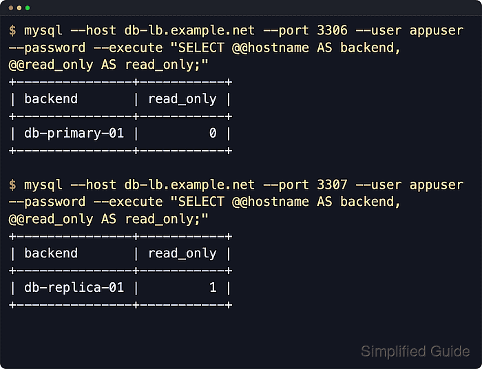 $ mysql --host db-lb.example.net --port 3307 --user appuser --password --execute "SELECT @@hostname AS backend, @@read_only AS read_only;" +---------------+-----------+ | backend | read_only | +---------------+-----------+ | db-replica-01 | 1 | +---------------+-----------+