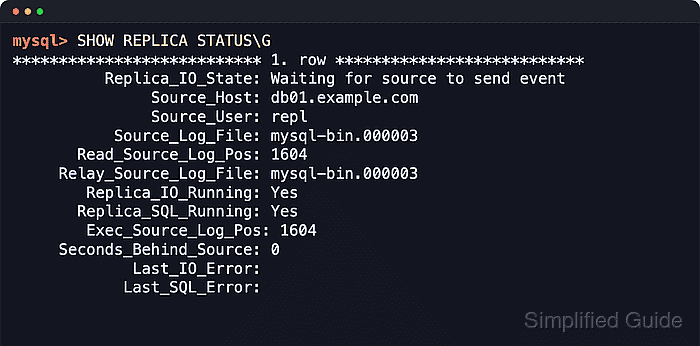 *************************** 1. ROW *************************** Replica_IO_State: Waiting FOR SOURCE TO send event Source_Host: db01.example.com Source_User: repl Source_Log_File: mysql-bin.000003 Read_Source_Log_Pos: 1604 Relay_Source_Log_File: mysql-bin.000003 Replica_IO_Running: Yes Replica_SQL_Running: Yes Exec_Source_Log_Pos: 1604 Seconds_Behind_Source: 0 Last_IO_Error: Last_SQL_Error: ##### snipped #####