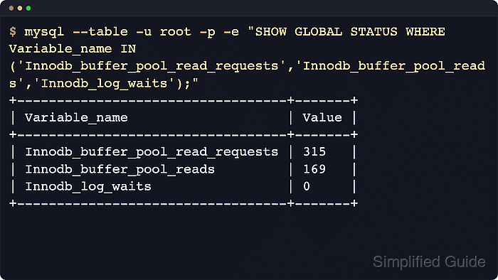 $ mysql --table -u root -p -e "SHOW GLOBAL STATUS WHERE Variable_name IN ('Threads_connected','Threads_running','Innodb_buffer_pool_read_requests','Innodb_buffer_pool_reads','Created_tmp_tables','Created_tmp_disk_tables','Innodb_log_waits');" +----------------------------------+-------+ | Variable_name | Value | +----------------------------------+-------+ | Created_tmp_disk_tables | 0 | | Created_tmp_tables | 7 | | Innodb_buffer_pool_read_requests | 315 | | Innodb_buffer_pool_reads | 169 | | Innodb_log_waits | 0 | | Threads_connected | 1 | | Threads_running | 1 | +----------------------------------+-------+Compare the change in these counters over the same load window before and after each tuning change instead of trusting one isolated sample.