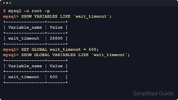 $ mysql --table -u root -p -e "SET GLOBAL wait_timeout = 600; SHOW GLOBAL VARIABLES LIKE 'wait_timeout';" +---------------+-------+ | Variable_name | Value | +---------------+-------+ | wait_timeout | 600 | +---------------+-------+