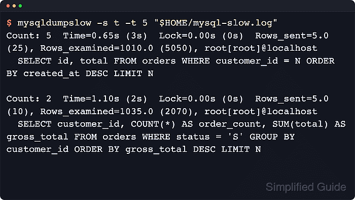 $ mysqldumpslow -s t -t 10 "$HOME/mysql-slow.log" Count: 5 Time=0.65s (3s) Lock=0.00s (0s) Rows_sent=5.0 (25), Rows_examined=1010.0 (5050), root[root]@localhost SELECT id, total FROM orders WHERE customer_id = N ORDER BY created_at DESC LIMIT N Count: 2 Time=1.10s (2s) Lock=0.00s (0s) Rows_sent=5.0 (10), Rows_examined=1035.0 (2070), root[root]@localhost SELECT customer_id, COUNT(*) AS order_count, SUM(total) AS gross_total FROM orders WHERE status = 'S' GROUP BY customer_id ORDER BY gross_total DESC LIMIT N