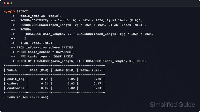 mysql> SELECT -> table_name AS `Table`, -> ROUND(COALESCE(data_length, 0) / 1024 / 1024, 2) AS `Data (MiB)`, -> ROUND(COALESCE(index_length, 0) / 1024 / 1024, 2) AS `Index (MiB)`, -> ROUND((COALESCE(data_length, 0) + COALESCE(index_length, 0)) / 1024 / 1024, 2) AS `Total (MiB)` -> FROM information_schema.TABLES -> WHERE table_schema = DATABASE() -> AND table_type = 'BASE TABLE' -> ORDER BY (COALESCE(data_length, 0) + COALESCE(index_length, 0)) DESC; +-----------+------------+-------------+-------------+ | Table | Data (MiB) | Index (MiB) | Total (MiB) | +-----------+------------+-------------+-------------+ | audit_log | 0.25 | 0.05 | 0.30 | | orders | 0.14 | 0.03 | 0.17 | | customers | 0.02 | 0.02 | 0.03 | +-----------+------------+-------------+-------------+ 3 rows in set (0.00 sec)This ranking reflects allocated table and index space reported by the storage engine, not every file under the data directory.