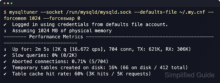 $ mysqltuner --socket /run/mysqld/mysqld.sock --defaults-file ~/.my.cnf --forcemem 1024 --forceswap 0 >> MySQLTuner 2.8.38 >> Run with '--help' for additional options and output filtering ✔ Logged in using credentials from defaults file account. ℹ Assuming 1024 MB of physical memory ✘ Assuming 0 MB of swap space (use --forceswap to specify) -------- Performance Metrics ----------------------------------------------------------------------- ℹ Up for: 2m 5s (2K q [16.672 qps], 704 conn, TX: 621K, RX: 306K) ✔ Slow queries: 0% (0/2K) ✔ Aborted connections: 0.71% (5/704) ✔ Temporary tables created on disk: 16% (66 on disk / 412 total) ##### snipped #####