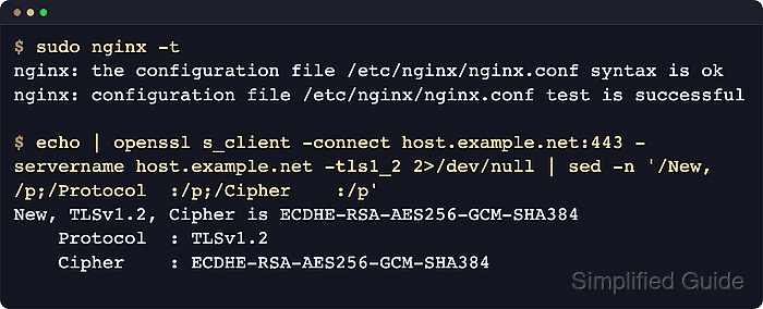 $ sudo nginx -T 2>&1 | sed -n '/host.example.net.conf:/,/ssl_conf_command/p' # configuration file /etc/nginx/sites-enabled/host.example.net.conf: server { listen 443 ssl; server_name host.example.net; ssl_certificate /etc/nginx/ssl/host.example.net.crt; ssl_certificate_key /etc/nginx/ssl/host.example.net.key; ssl_protocols TLSv1.2 TLSv1.3; ssl_prefer_server_ciphers on; ssl_ciphers ECDHE-ECDSA-AES256-GCM-SHA384:ECDHE-RSA-AES256-GCM-SHA384:ECDHE-ECDSA-CHACHA20-POLY1305:ECDHE-RSA-CHACHA20-POLY1305:ECDHE-ECDSA-AES128-GCM-SHA256:ECDHE-RSA-AES128-GCM-SHA256; ssl_conf_command Ciphersuites TLS_AES_256_GCM_SHA384:TLS_CHACHA20_POLY1305_SHA256:TLS_AES_128_GCM_SHA256;nginx -T is useful when the active configuration is assembled through several include directives and symlinked site files.
